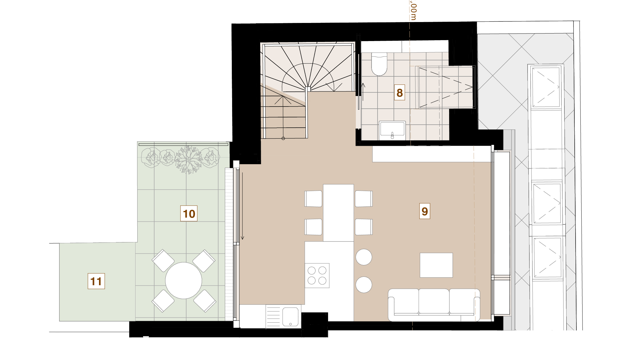 91,41 m2, ca. 34m2 Freifläche (Terasse) + Kellerabteil.